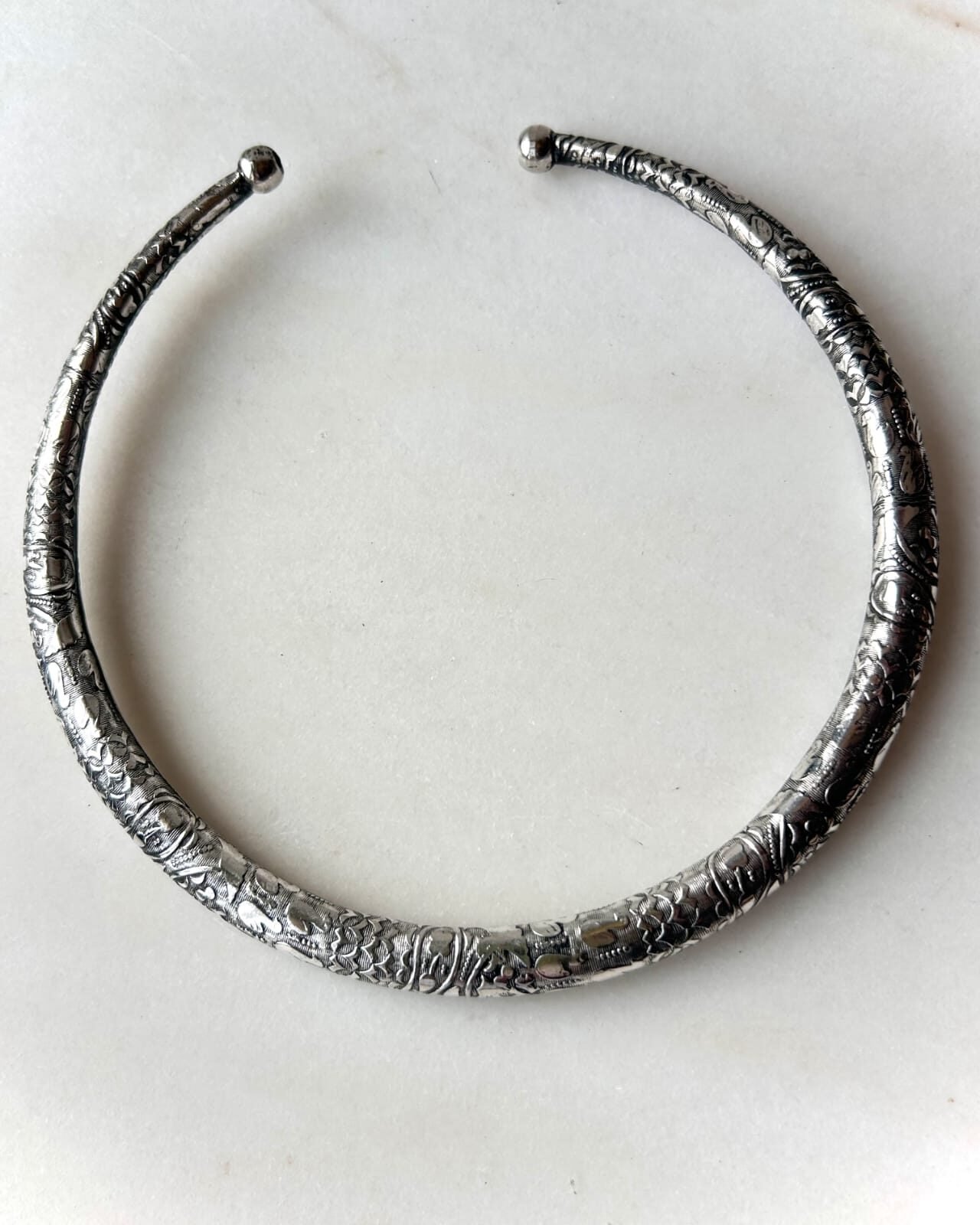 Sacred Script Engraved Silver Tone Brass Choker Set A sleek silver tone brass choker engraved with flowing…