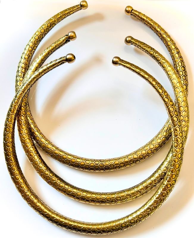 Serpent Torque Brass Choker Set A set of three richly striking brass torque chokers with embossed serpent-scale…