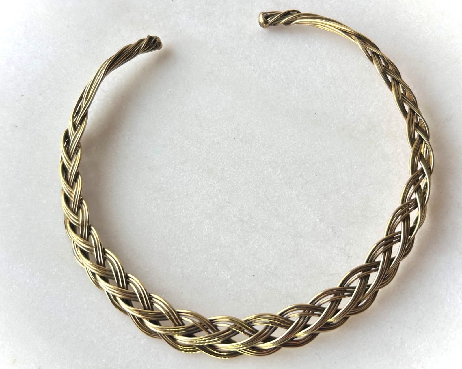Braided Interwoven Horizon Brass Choker Set A sculptural brass choker formed from intricately braided wires, creating a…