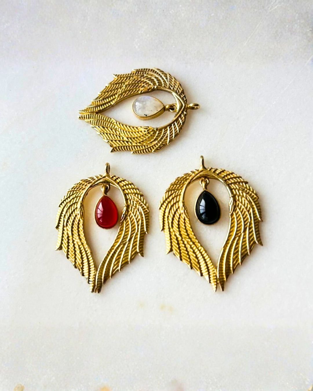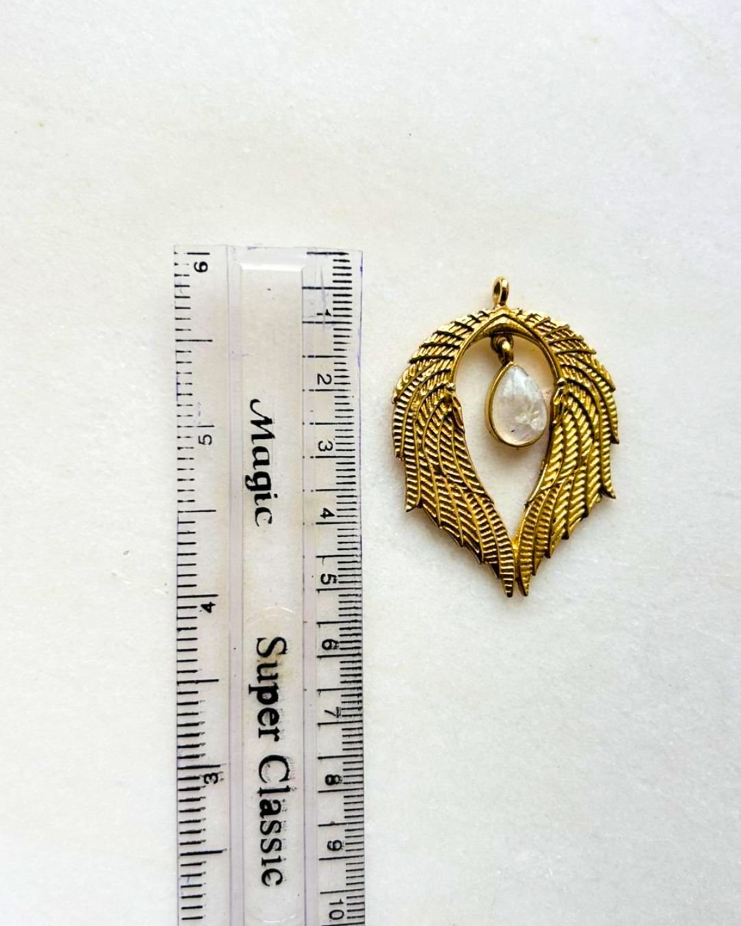 Elegant angel wing–shaped brass pendant featuring layered feather details and a suspended white stone drop. A symbolic and graceful piece for statement or spiritual jewelry designs.