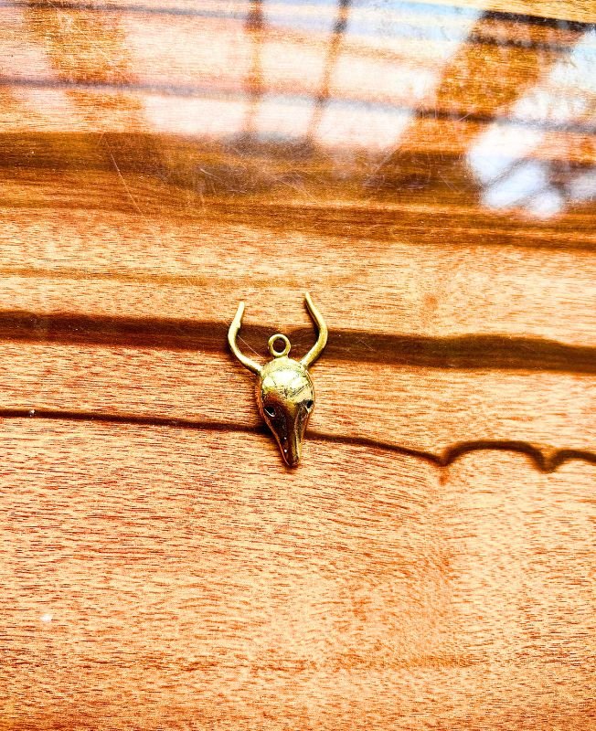 This intricately crafted brass pendant features the stylized form of an antelope skull with long curved horns. The design merges raw natural symbolism with refined casting techniques, giving it both a rustic and luxurious feel. The pendant has a smooth polished finish that enhances the sculptural form and a strong top loop for easy stringing onto chokers, cords, or chains.