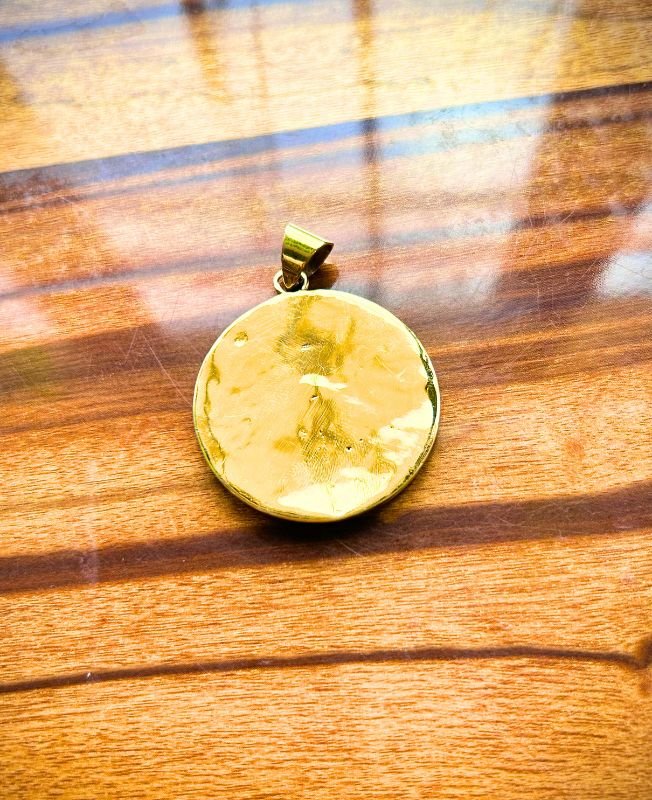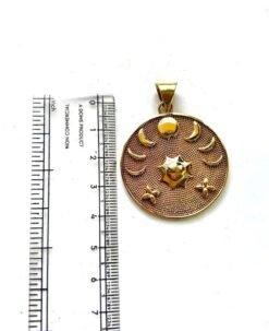 Channel the cosmic rhythm with this statement celestial brass pendant. The round design is intricately embossed with a radiant sun at the center, surrounded by crescent moon phases and star motifs, all set against a finely textured surface that adds visual depth and sparkle. Crafted from solid brass, this pendant captures the energy of the universe in wearable form, perfect for symbolic jewelry creations and metaphysical-inspired collections. Its generous size and bold presence make it ideal for necklaces or statement chokers.