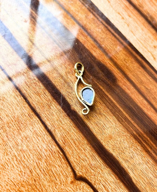 This handcrafted brass pendant showcases a refined teardrop stone at its center, embraced by a smooth swirling brass frame that highlights its natural beauty. The design combines minimalism with a touch of sophistication, suitable for everyday wear or as an accent piece for layered necklaces. The pendant’s antique brass tone brings warmth and character, while the gemstone adds a hint of natural elegance.