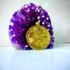 This round brass pendant features a beautifully embossed lotus flower design centered with seven colored gemstone beads, each symbolizing one of the body’s chakras. The vibrant stones include deep red, orange, yellow, green, turquoise, indigo, and violet tones, each placed vertically along the center of the pendant to encourage alignment and balance.