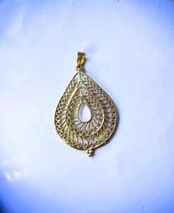 This large teardrop-shaped brass pendant showcases traditional filigree craftsmanship with a symmetrical, lace-like pattern and a hollow center. The fine wirework forms nested layers of ornate loops within a bold teardrop frame, offering a lightweight yet visually impactful design.