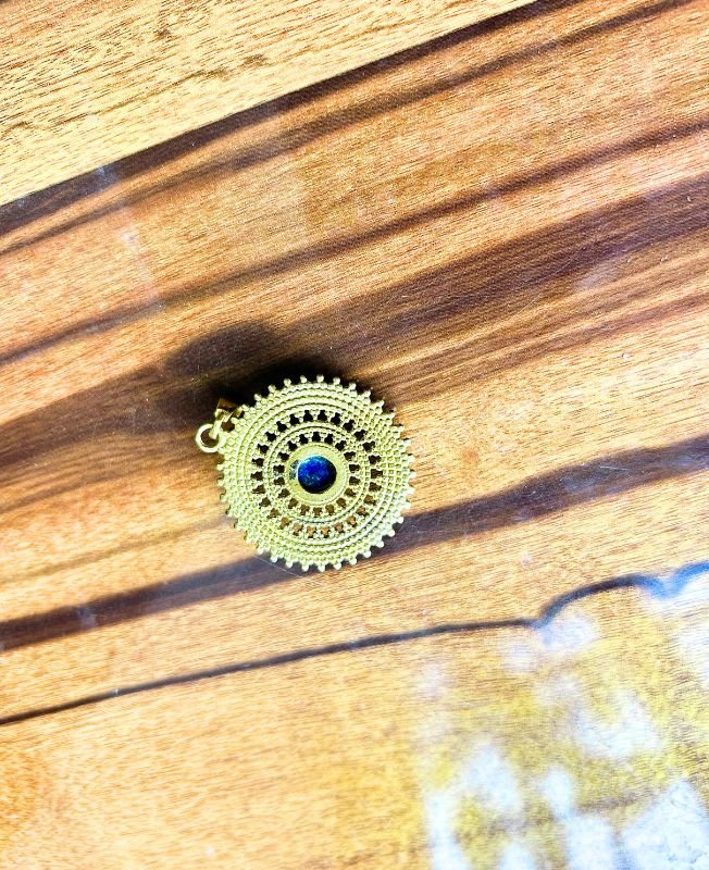 This vintage-style brass pendant is shaped like a radiant sunburst medallion, showcasing a deep blue cabochon stone at its center. The layered dotted texture radiates outward in perfect symmetry, giving the piece a powerful yet elegant appearance. Ideal for macramé necklaces, chokers, or statement chains, this pendant captures both celestial symbolism and antique aesthetics. The deep blue cabochon adds contrast and depth, making it a standout focal piece. Lightweight but bold, it’s a versatile addition to any jewelry-making collection.