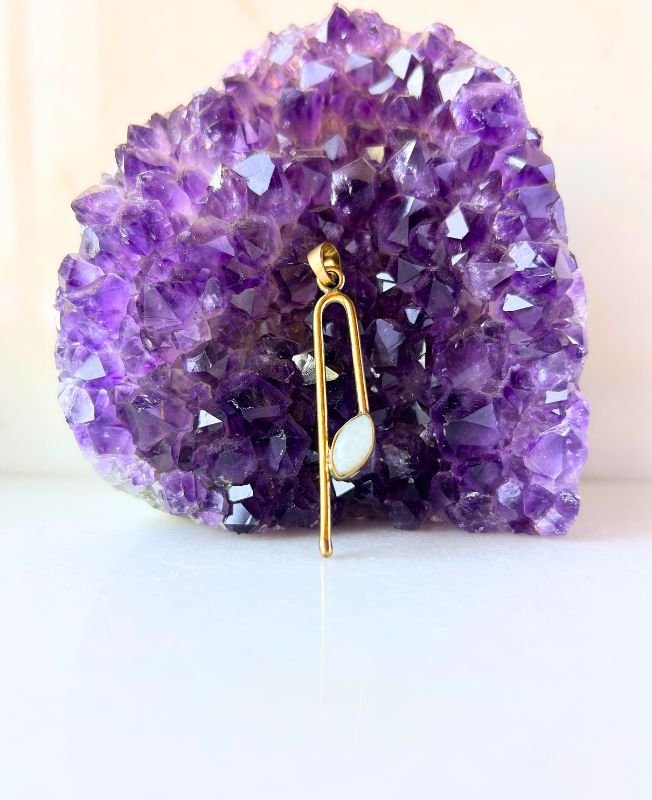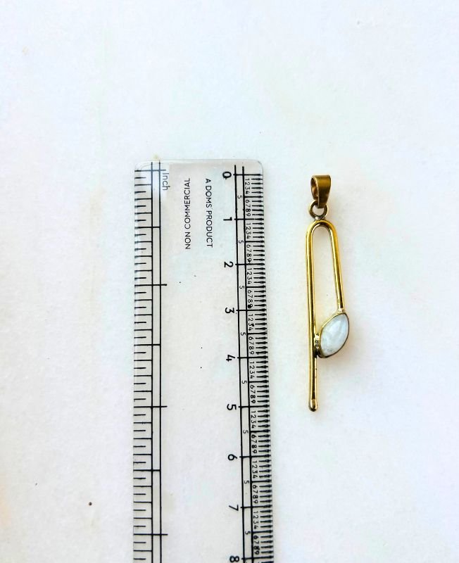 This handcrafted brass pendant presents a sleek and contemporary design inspired by modern minimalism. The elongated vertical bar creates a refined, elongated silhouette, complemented by a polished oval white stone that adds an elegant focal point. The stone’s subtle iridescence reflects purity and balance, making this pendant ideal for both spiritual and fashion-forward styles.