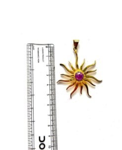 This striking brass pendant captures the essence of the sun with a bold sunburst design and a vivid magenta cabochon at its heart. The swirling rays extend gracefully outward, channeling warmth and vitality in every direction. Handcrafted with rich detail, the piece radiates strength and spiritual energy, making it a powerful talisman or a statement accessory for daily wear. Ideal for lovers of symbolic jewelry and seekers of radiant aesthetics.