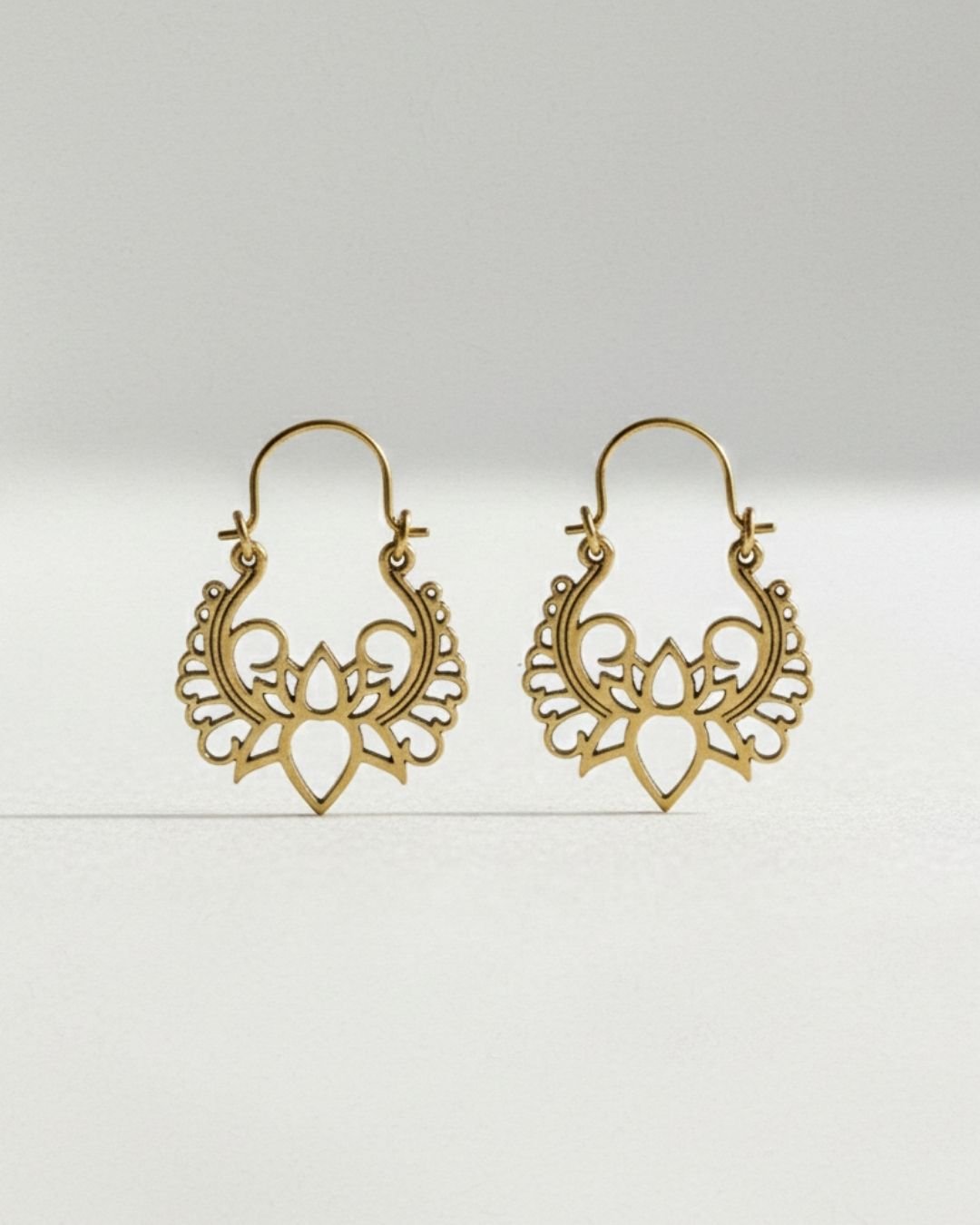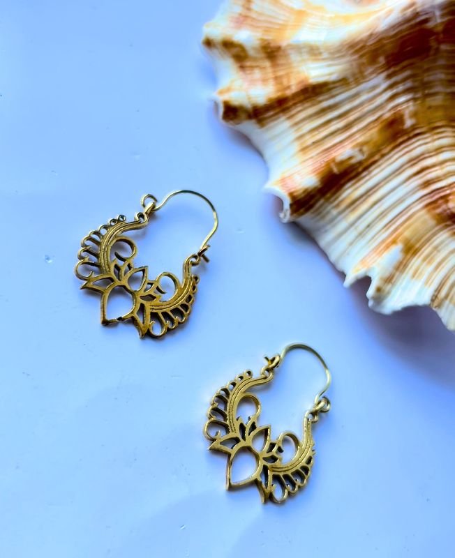 These stunning Lotus Blossom Tribal Hoop Earrings are designed to make a statement. Featuring a graceful lotus flower at the center, surrounded by ornate tribal-style curves and cutouts, these earrings embody a balance of elegance and edge. Cast in high-quality brass with a matte gold tone finish, they are both durable and fancy, making them perfect for all-day wear