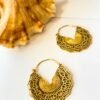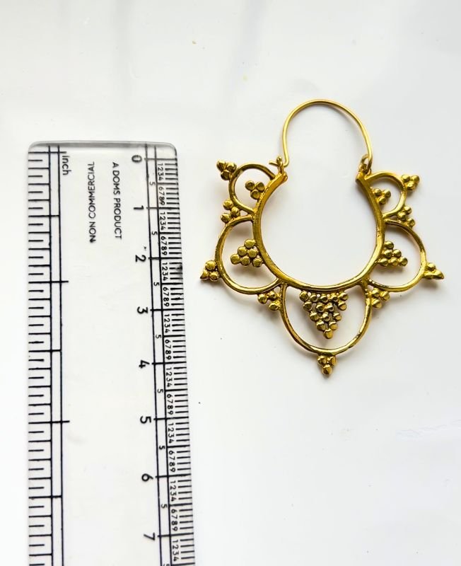 These handcrafted hoop earrings feature intricate grape-cluster-style detailing along a rounded floral frame. The antique gold tone adds a warm, vintage feel, while the scalloped silhouette makes them stand out for ethnic, tribal, or festival-inspired styling.