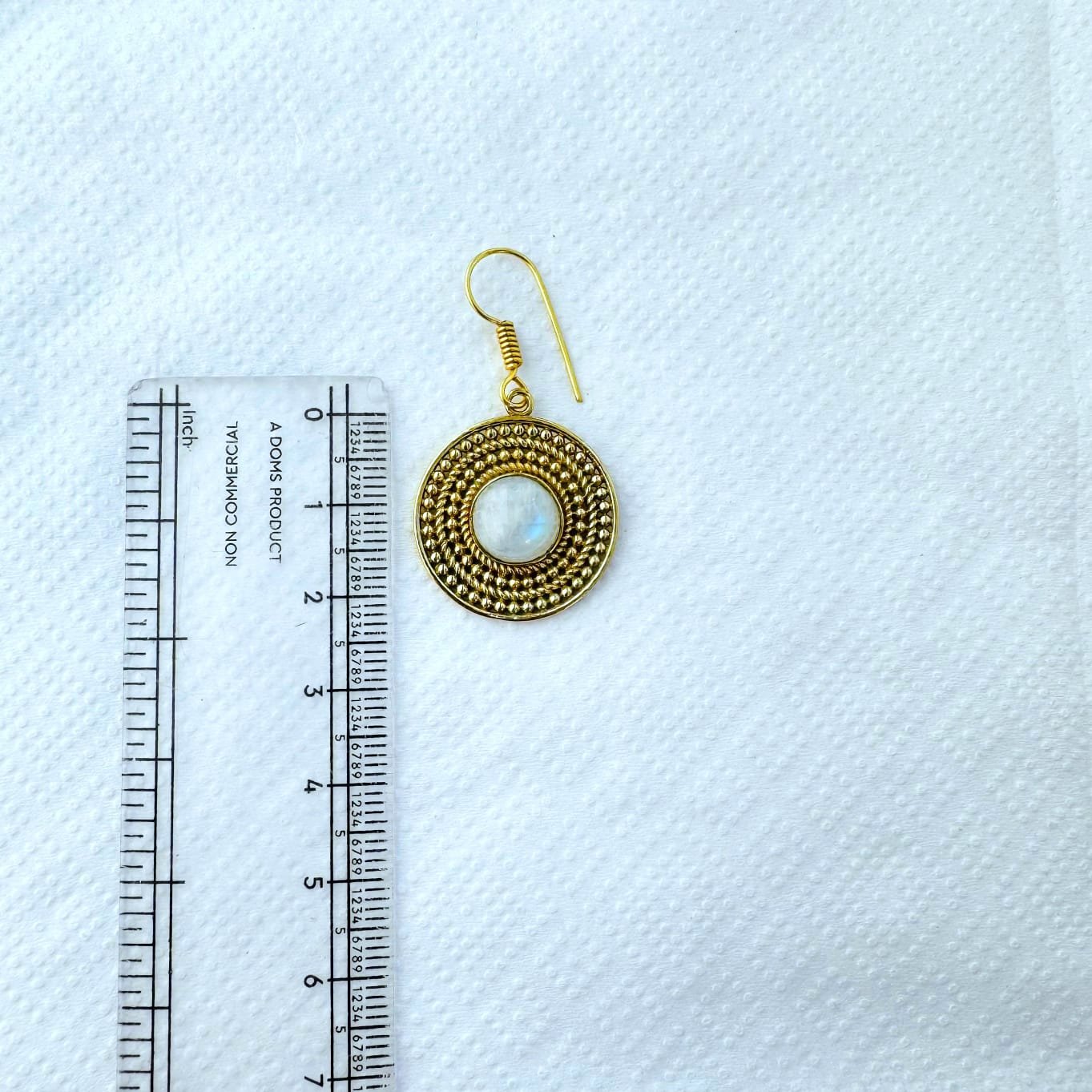 These handcrafted brass earrings showcase a classic circular design with a beautiful moonstone set at the center. The stone is surrounded by finely detailed dotted brass patterns, creating texture, depth, and a rich artisanal feel.