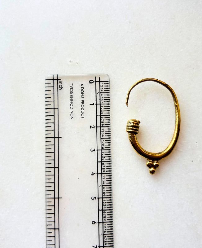 This elegant tribal-style brass hoop earring showcases a beautiful vintage crescent shape, skillfully handcrafted with traditional techniques. The design features delicate wrap accents and small bead embellishments that enhance its timeless aesthetic.