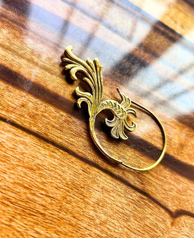 This exquisite brass filigree leaf hook earring is a stunning statement piece inspired by nature. The design features elegant curves and leaf-like motifs with a beautifully textured finish. Handcrafted from durable brass, this piece combines traditional craftsmanship with contemporary style. Perfect for bohemian, ethnic, or artistic looks, it can be worn as a single earring or as part of an asymmetrical jewelry combination.