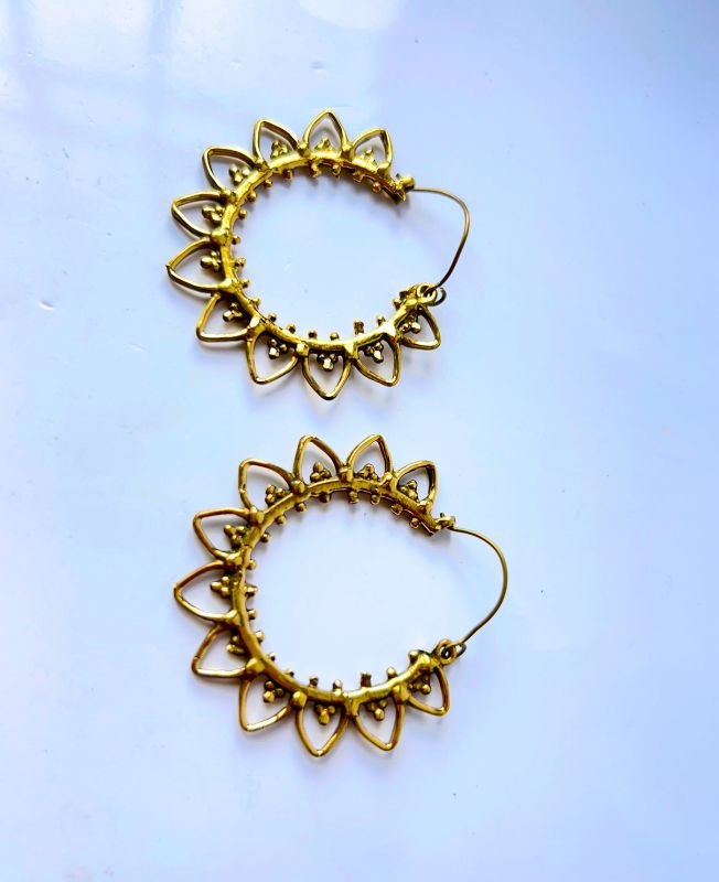 These striking hoop earrings feature an intricate floral-like pattern of open petal loops radiating around the circular base. Each loop is adorned with dotted beadwork that adds beautiful depth and texture. Made from durable brass in an antique gold finish, these earrings are ideal for statement jewelry or ethnic-inspired looks.