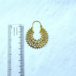 These brass crescent filigree earrings showcase a beautifully detailed openwork design inspired by traditional ethnic jewelry. The crescent shape is filled with flowing teardrop and vine-like filigree patterns, finished with tiny decorative brass dots along the outer edge for added texture and movement.