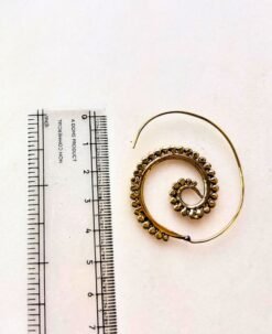 This exquisite brass spiral earring showcases a captivating design inspired by ancient tribal jewelry. The smooth spiral form is accentuated with tiny beaded motifs that create a rhythmic texture, giving it a refined yet earthy appeal. Each piece is meticulously handmade to preserve the authentic artisanal touch, making it both durable and lightweight for comfortable wear.