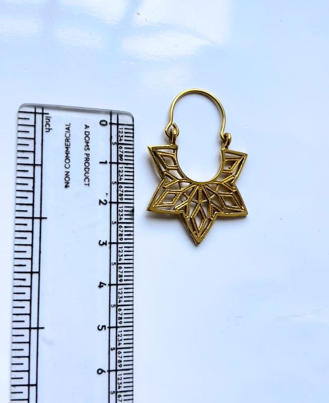 These handcrafted brass earrings showcase an intricate geometric flower design with symmetrical lines and bold angles. Finished in a warm antique gold tone, they offer a perfect balance of structure and elegance. The lightweight construction and striking shape make them an excellent choice for bold yet wearable accessories.
