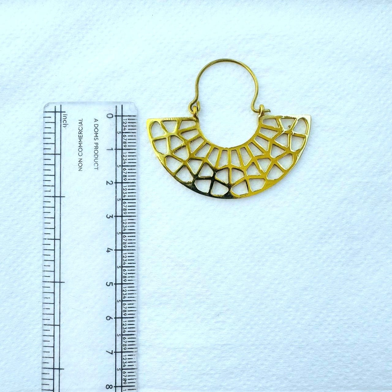 These geometric fan-shaped brass earrings feature an elegant openwork pattern inspired by natural and architectural forms. Finished in a warm gold tone, they create a bold yet airy look that makes them comfortable to wear while still standing out.