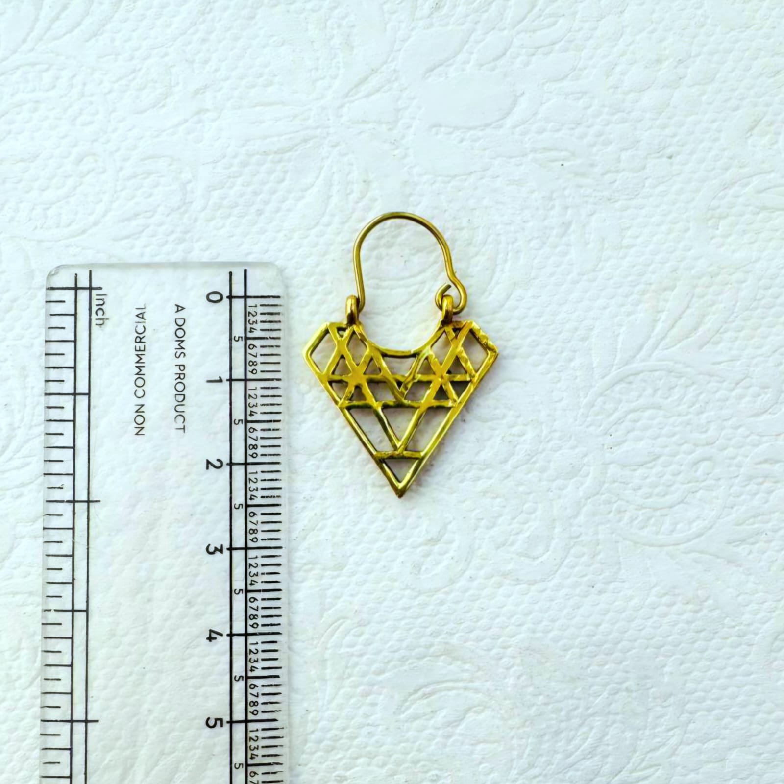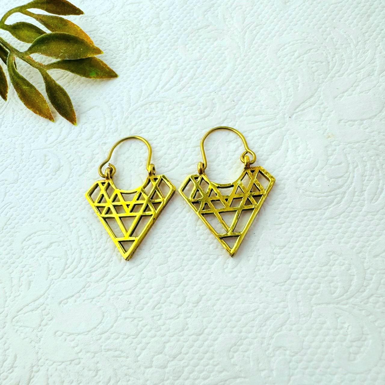 Make a sophisticated statement with these uniquely crafted Geometric V-Shape Brass Earrings. These earrings blend modern architectural lines with a rustic, handcrafted feel, resulting in a versatile piece that stands out without being overbearing.