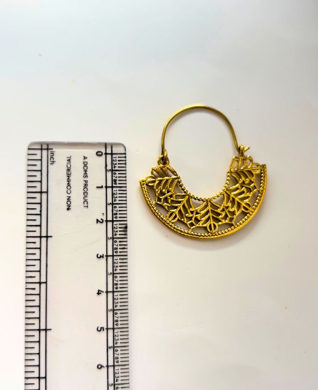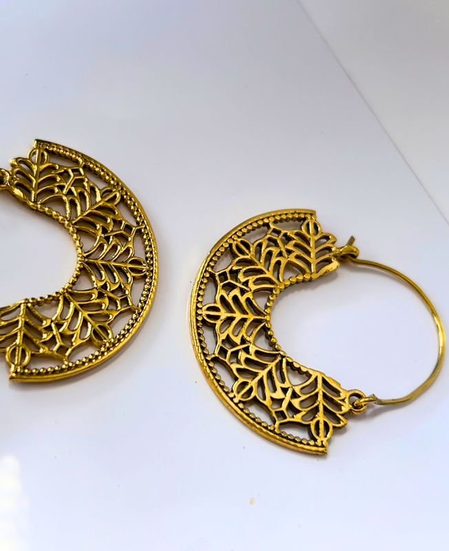 These stunning hoop earrings feature a beautifully detailed leaf lattice pattern crafted in an antique gold finish. With their striking brass construction and artistic design, they bring a graceful and earthy aesthetic to any outfit.