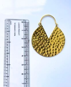 These eye-catching brass earrings combine geometric elegance with a handcrafted hammered texture. The round disc is accented by a dramatic V-cut teardrop opening at the top, adding a modern twist to a classic ethnic shape. Made from high-quality brass in a rich golden tone, they are ideal for those looking to make a bold fashion statement with a touch of artisanal charm.