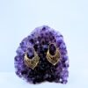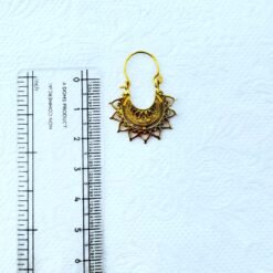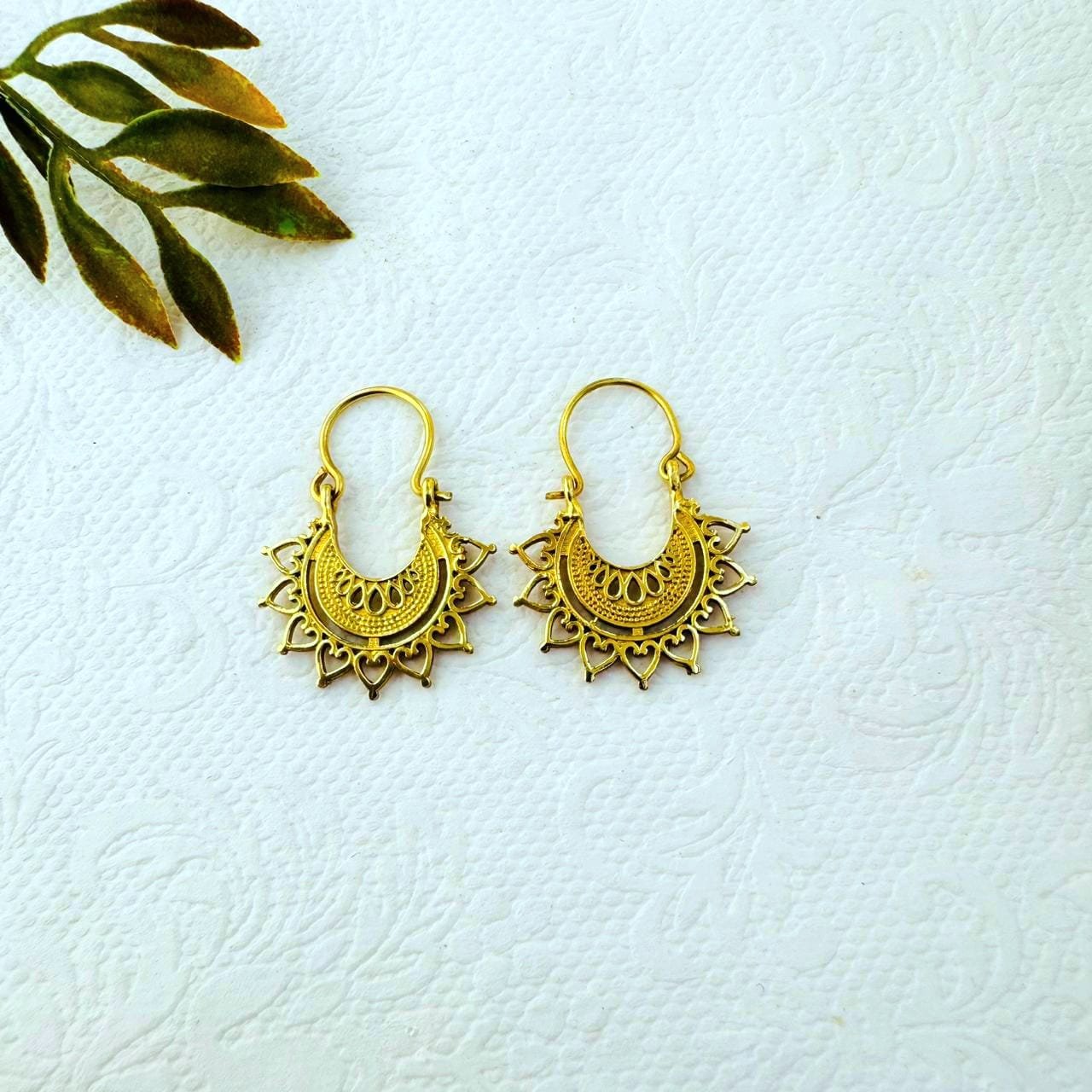 This exquisite brass earring features a unique crescent design framed with delicate heart-like details, giving it a romantic and tribal aesthetic. Handcrafted in India with traditional techniques, it carries a warm golden tone that enhances any jewelry design.