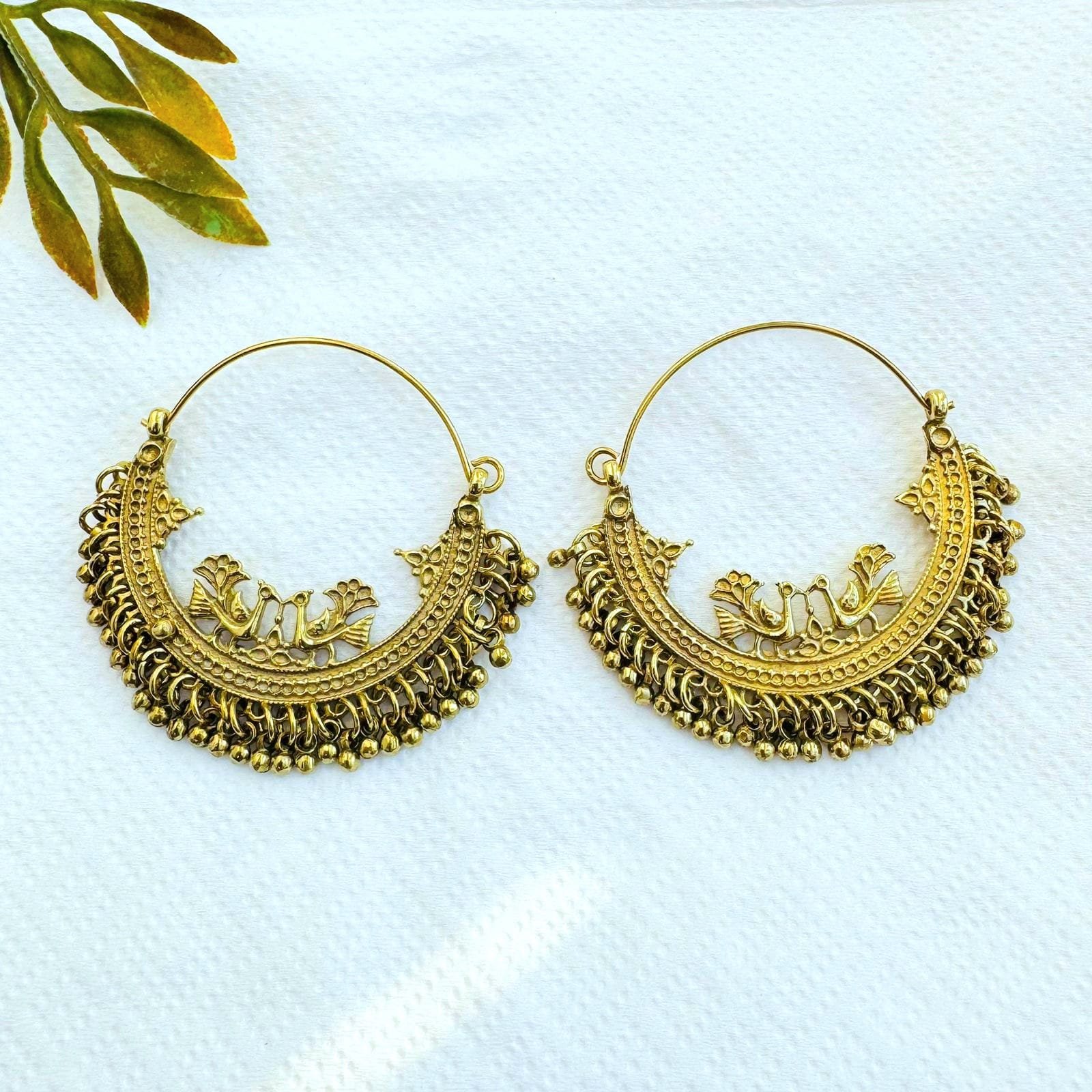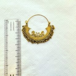 These striking brass crescent hoop earrings feature a classic half-moon silhouette adorned with fine embossed detailing and a dense fringe of tiny brass beads. The layered texture and rhythmic movement of the fringe give these earrings a strong tribal presence while remaining elegant and wearable.
