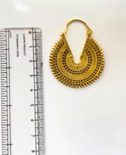 These bold and eye-catching tribal earrings are handcrafted from high-quality brass in an antique gold finish. Featuring a detailed sunburst design with layered textures and intricate dotted accents, these earrings make a striking statement with any bohemian or ethnic-inspired outfit.
