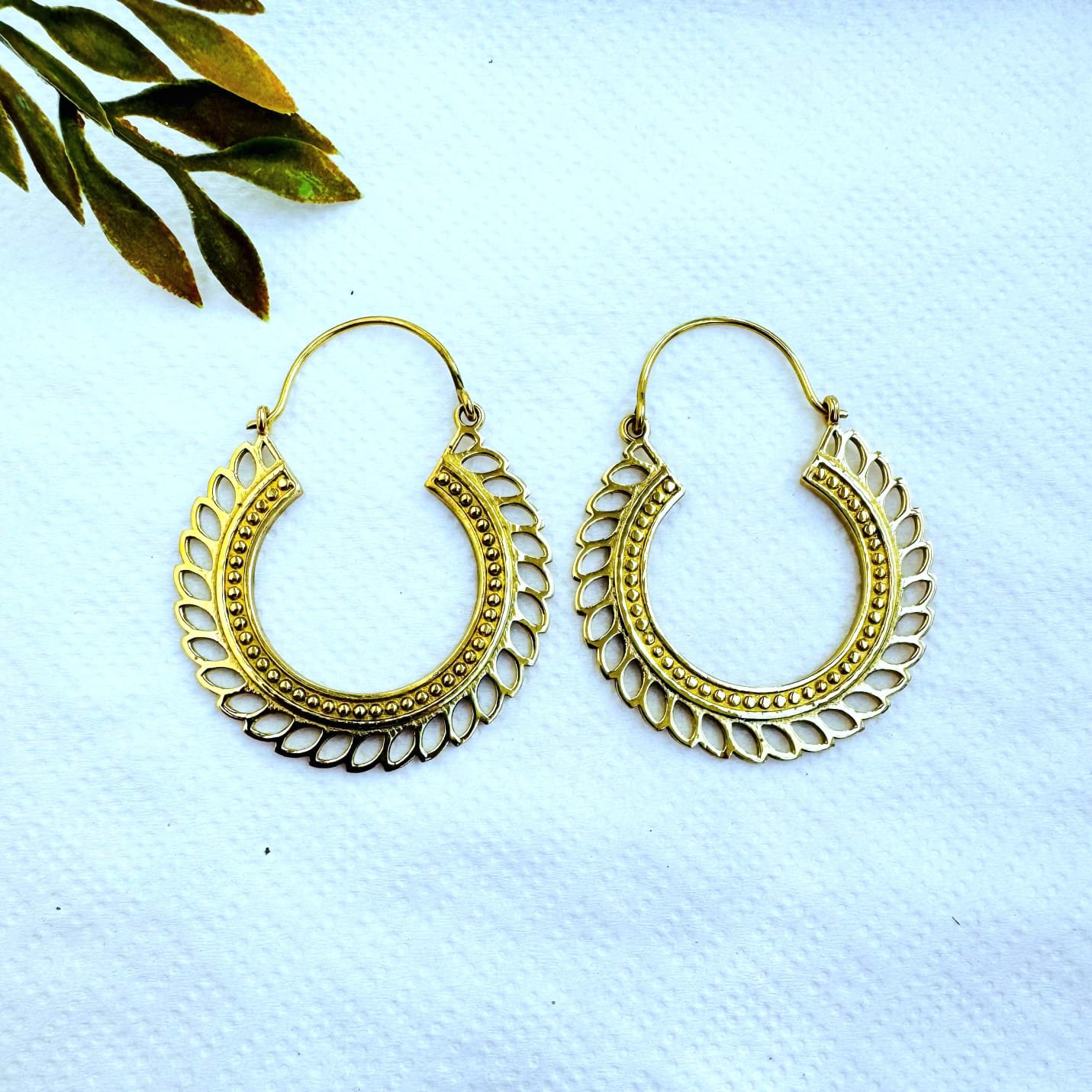 These ornamental brass hoop earrings showcase a beautiful balance between softness and structure. The inner hoop is decorated with fine dotted texture, while the outer edge is framed by repeated leaf-like shapes, giving the earrings a natural, flowing rhythm.