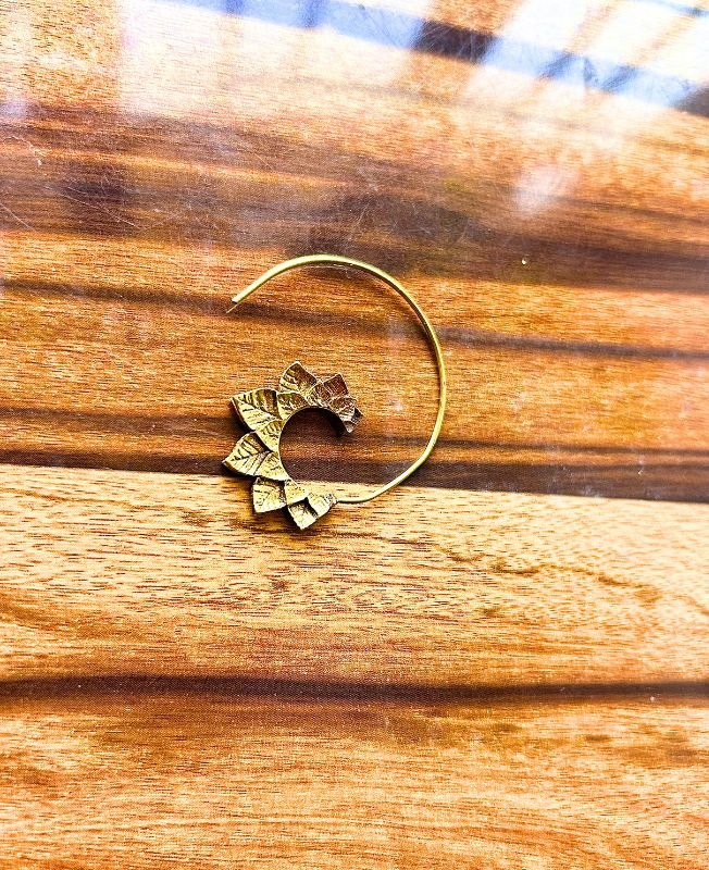 This handcrafted brass hoop earring features detailed tribal-inspired etching that creates a bold yet refined statement piece. Made from high-quality raw brass, it combines durability with a unique golden tone that ages beautifully over time.