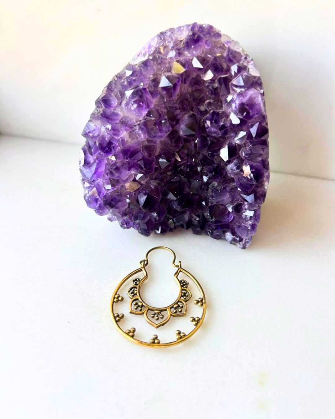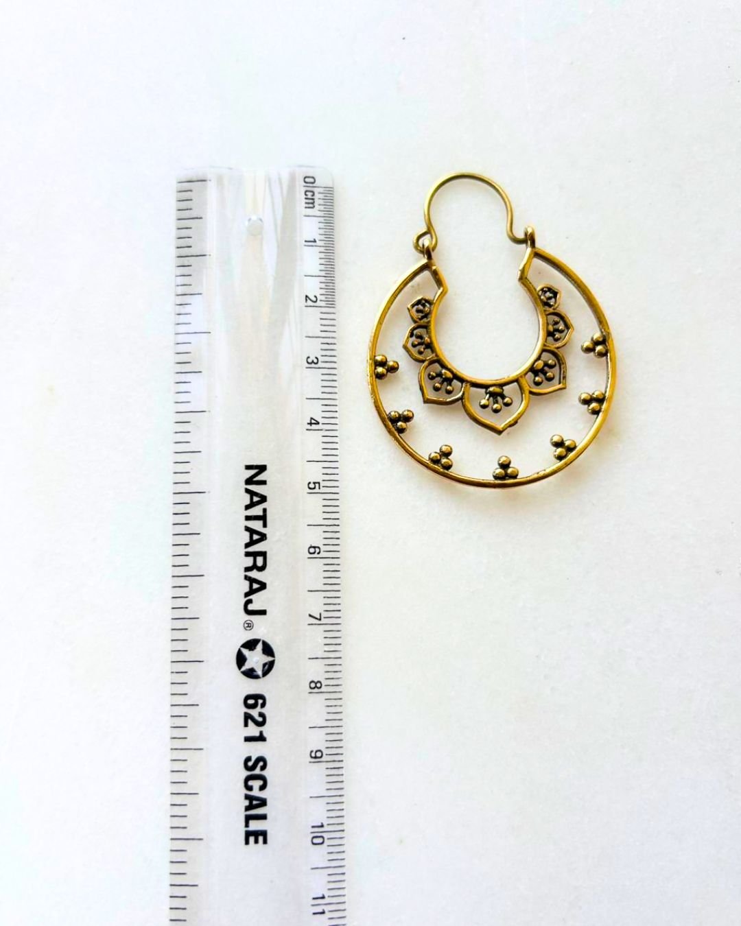 Handcrafted gold plated brass earring featuring a central lotus motif and delicate dotted detailing. Lightweight and perfect for a bold yet elegant look.
