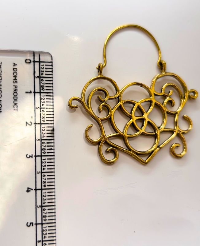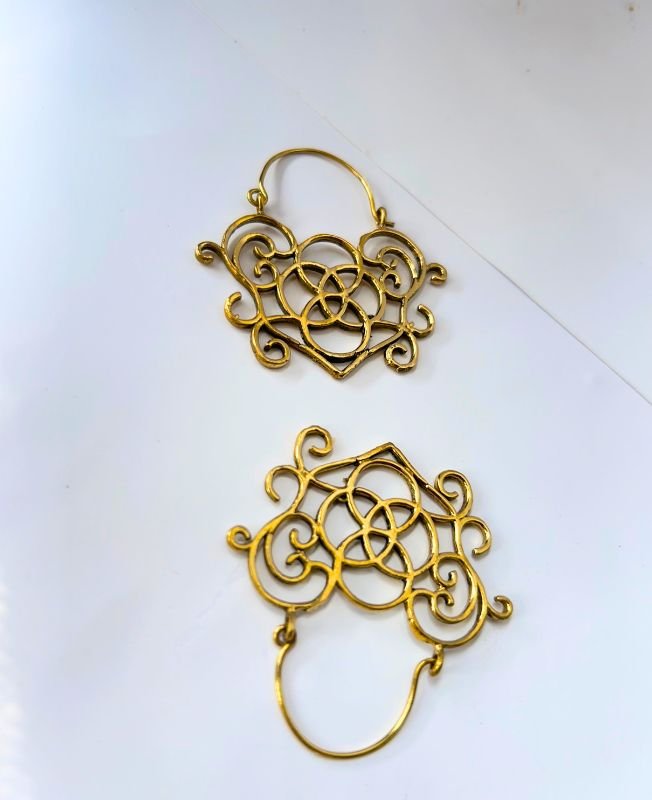 These intricate hoop earrings showcase a romantic heart-shaped motif combined with Celtic-style swirls and curves. Crafted in antique gold-tone brass, they are perfect for adding artistic elegance to bohemian, tribal, or festival looks.