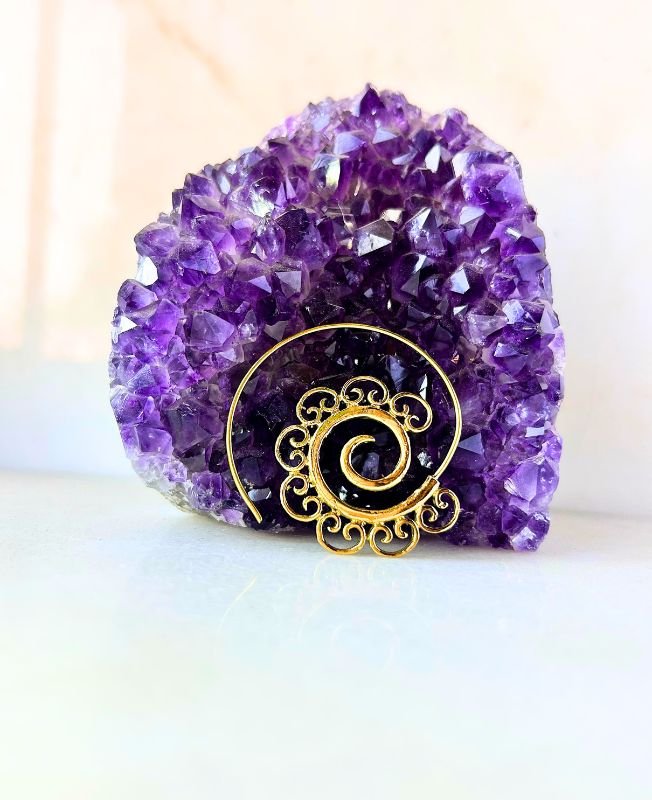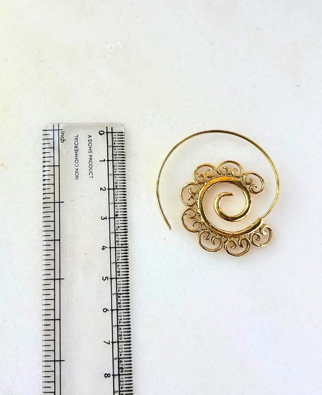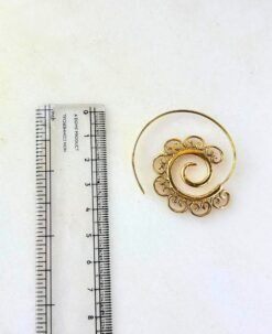 Elegant brass spiral earring with ornate filigree detailing, perfect for boho, tribal, or ethnic-inspired looks.