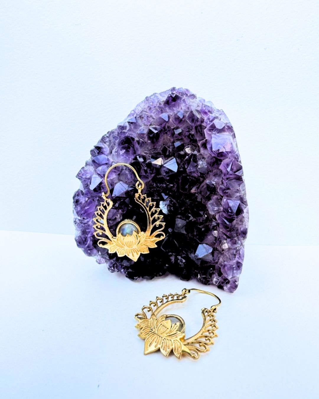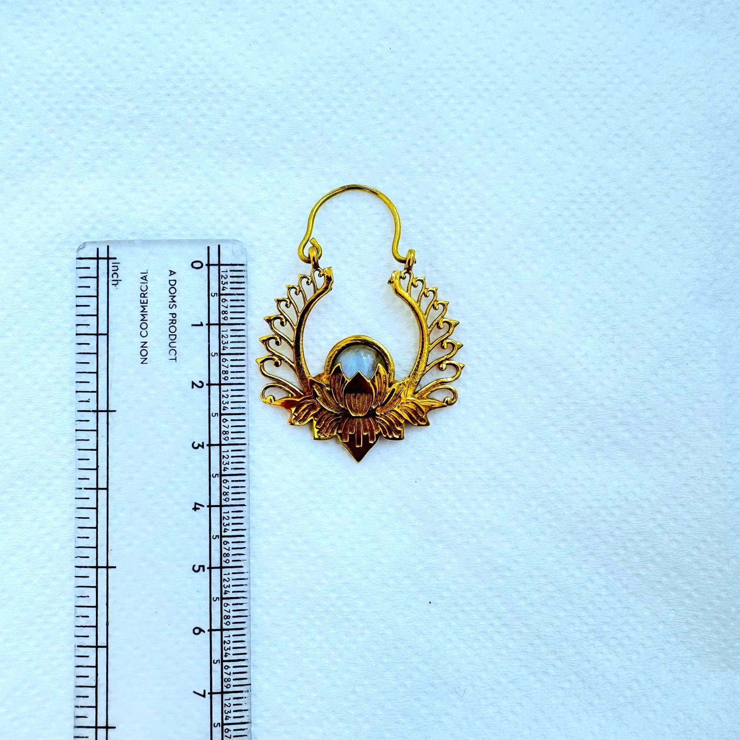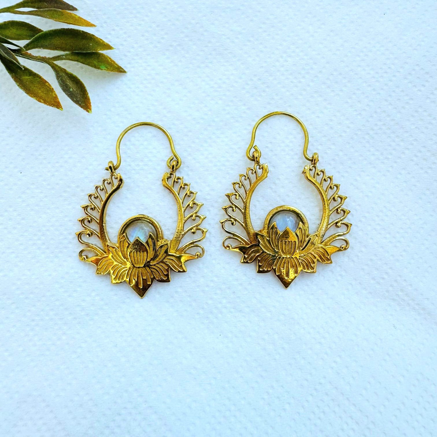 These handcrafted brass earrings showcase an intricate mandala-inspired floral design set within a rounded silhouette. The layered cut-out pattern creates beautiful depth and symmetry while allowing light to pass through, giving the earrings an airy yet rich appearance.