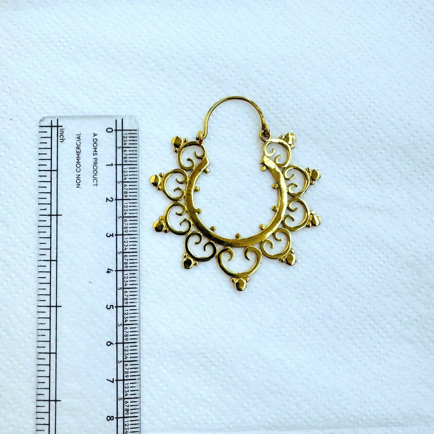 These ornate brass crescent hoop earrings feature a beautifully curved crescent base adorned with flowing scrollwork and delicate rounded accents. The openwork design creates a light, airy feel while maintaining a rich, decorative presence.