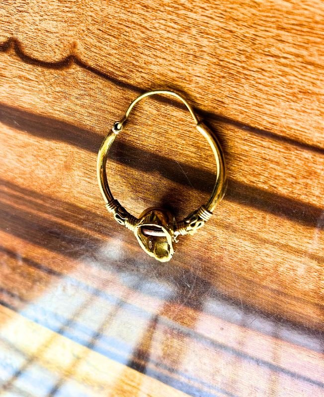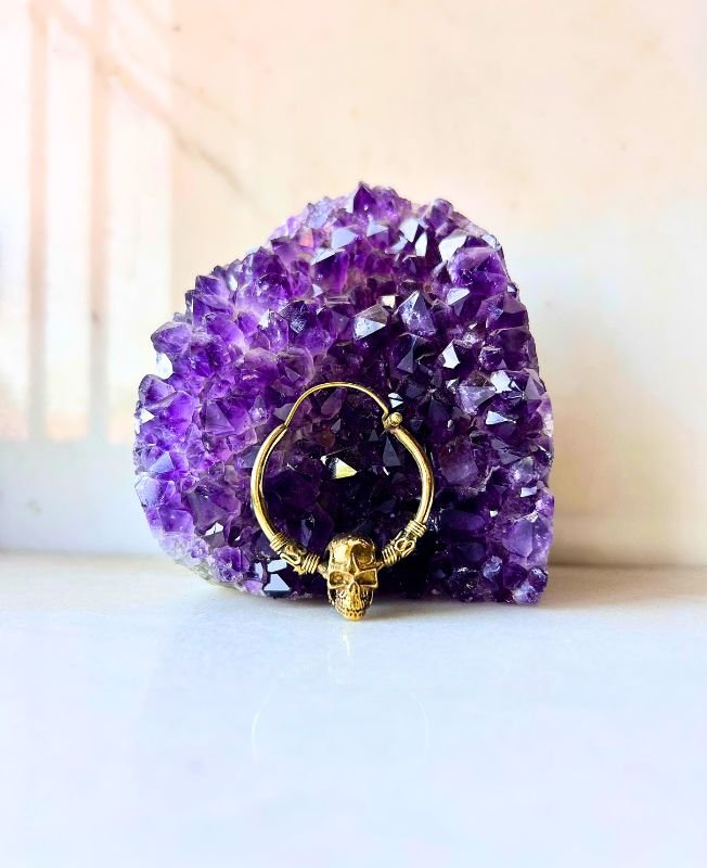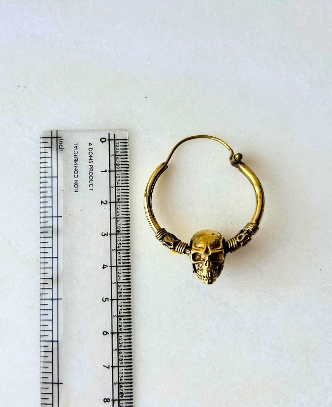 This striking brass hoop earring showcases a finely crafted skull centerpiece, blending tribal artistry with contemporary design. Made from solid brass, it exudes a warm, antique finish that adds depth and character. The skull motif symbolizes strength, transformation, and fearless individuality — making it a standout accessory for both men and women.