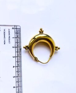 This striking golden hoop earring is crafted in a traditional tribal crescent shape, featuring ornate spherical accents on three sides. Designed with a sturdy hinged clasp, it reflects a bold, ethnic aesthetic
