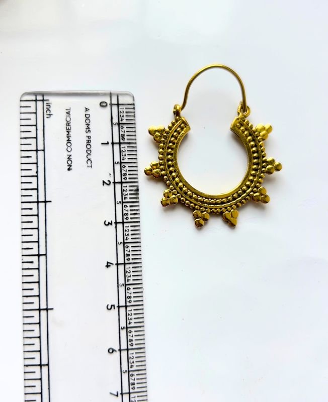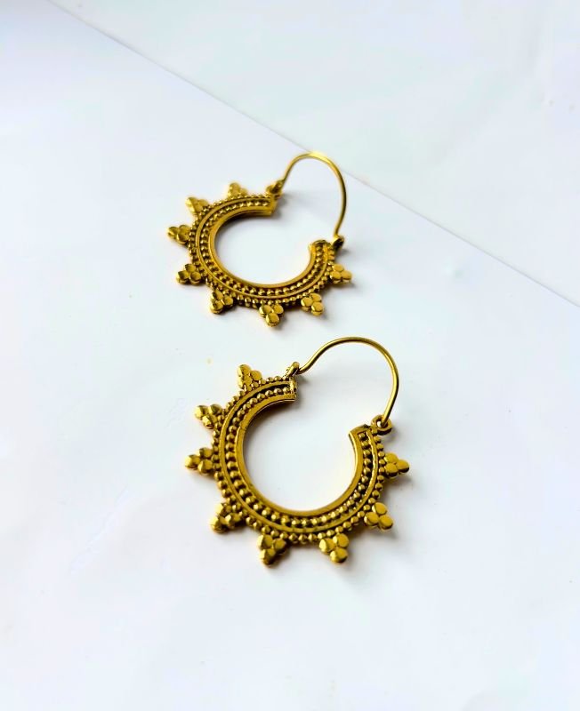 These radiant tribal hoop earrings are crafted in an antique gold tone and feature ornate outer detailing with dotted beading that adds texture and traditional charm. Lightweight yet statement-worthy, they blend ethnic elegance with bold design.