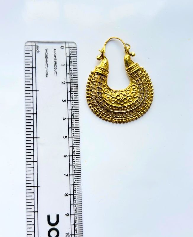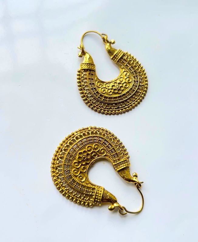 These handcrafted brass earrings are designed to bring out a perfect balance of traditional artistry and modern bohemian aesthetics. The unique semi-hoop silhouette is adorned with intricate floral motifs and geometric patterns, giving the earrings a bold yet elegant appeal. Each detail is carefully hand-carved by skilled artisans, making every piece truly unique.