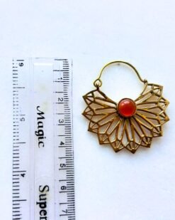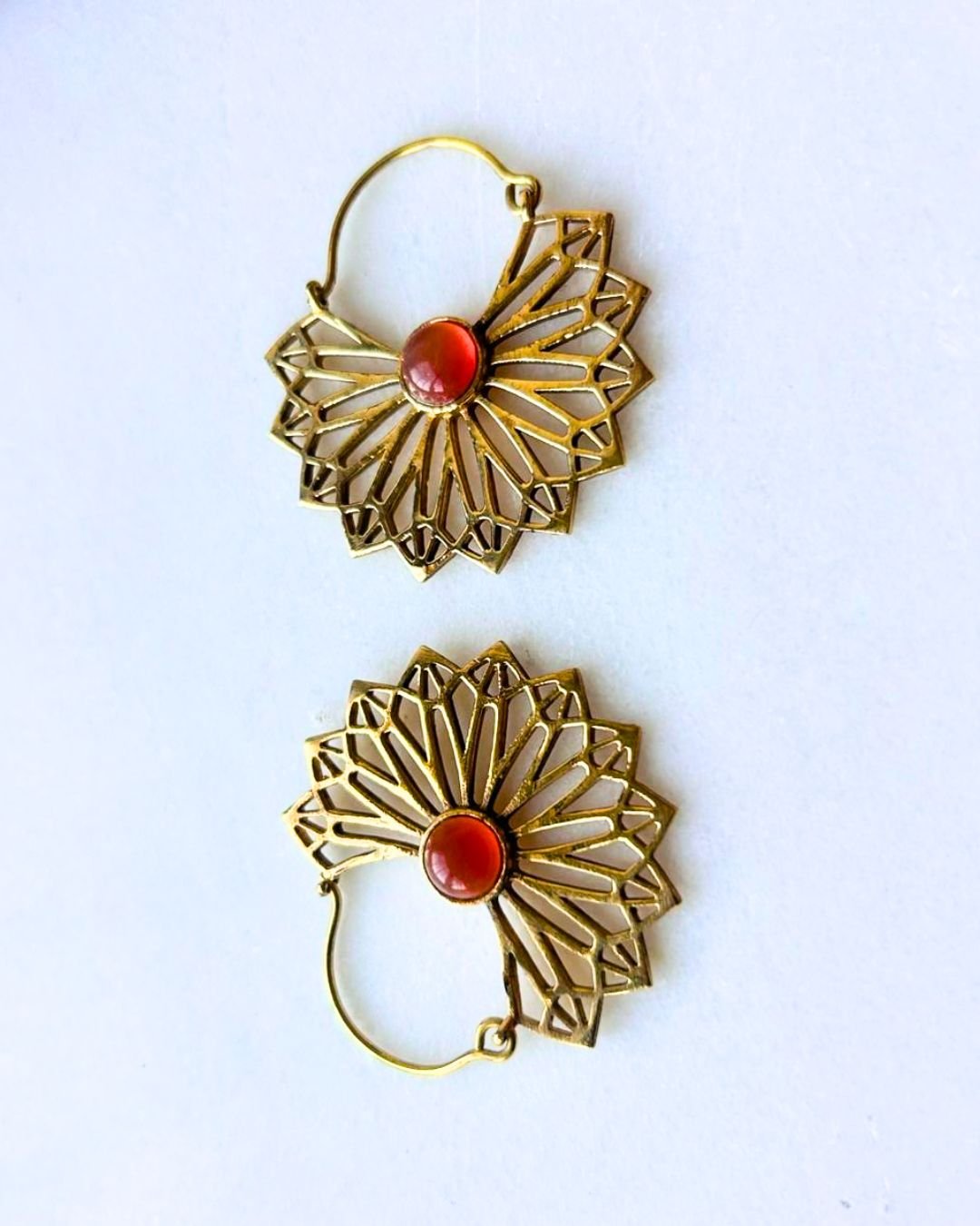 This bold brass earring features an elegant fan or sunburst-inspired silhouette, radiating outward from a vibrant red stone center piece. The openwork geometric detailing creates a light yet dramatic structure, allowing the design to feel airy while maintaining strong visual impact. The warm brass tone enhances the intricate lines and angular edges, while the smooth round red stone adds a powerful focal point. The contrast between the detailed metalwork and the polished stone creates balance and depth, making the piece both artistic and expressive.