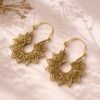 Step into timeless tradition with these antique gold crescent hoop earrings, featuring fine etched detailing inspired by tribal art and ancient patterns. Designed to make a statement, they blend heritage with bold bohemian aesthetics. Each piece is crafted with precision, highlighting a symmetrical layered design with floral and dotted motifs.