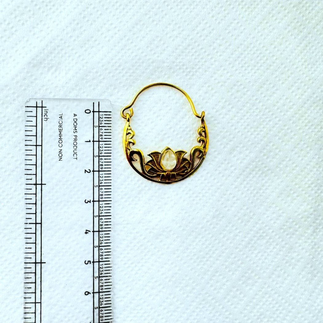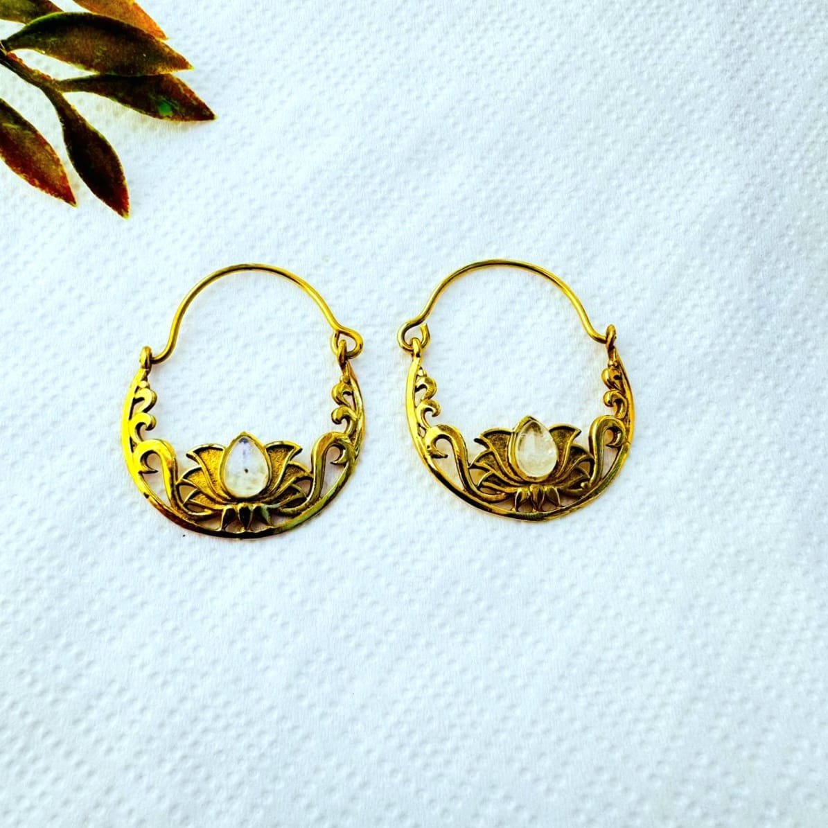These earrings showcase a classic crescent silhouette adorned with an intricate lotus flower at the base. Flanked by elegant swirling vine-like details, the centerpiece is a teardrop-set cabochon that captures and reflects light beautifully. The warm, golden hue of the brass provides a vintage, antiqued look that complements any skin tone.