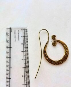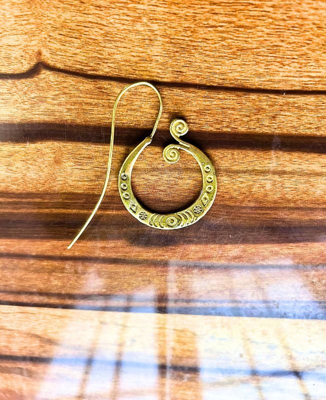 This stunning brass earring showcases a spiral filigree design, blending ancient symbolism with contemporary bohemian artistry. The handcrafted details and engraved motifs make each piece unique, reflecting the traditional tribal style often seen in historical adornments.