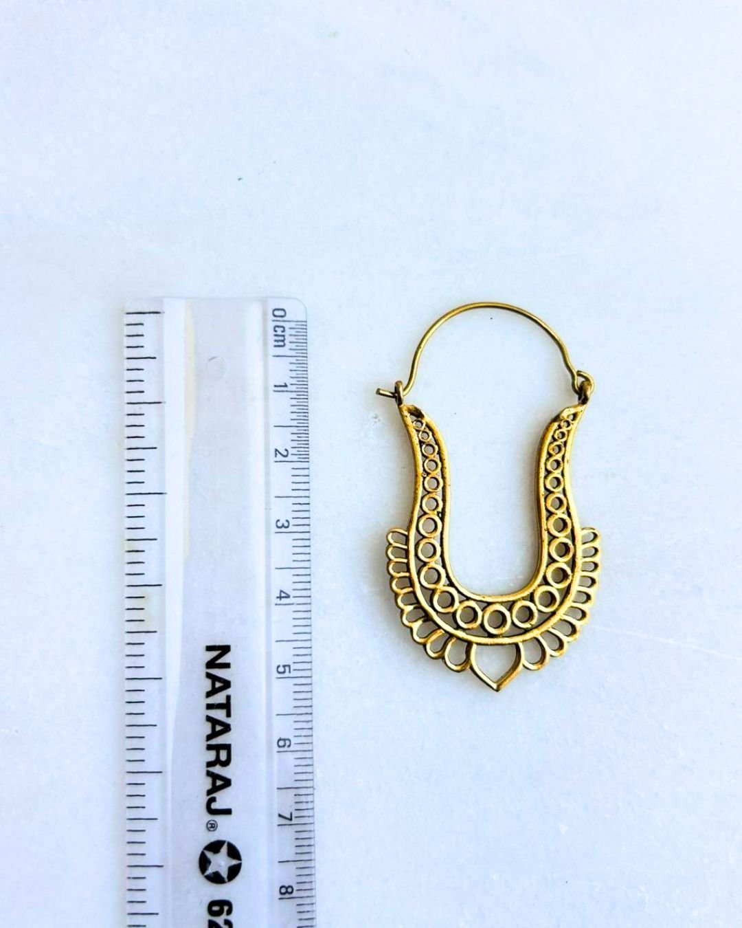 This eye-catching brass hoop earring features a distinctive elongated U-shape design that gives it a bold yet elegant silhouette. The inner curve is decorated with raised circular dot patterns, creating texture and depth, while the lower edge is enhanced with delicate scalloped detailing for a refined ornamental finish. The open hoop top keeps the structure light and wearable, while the decorative lower portion adds statement appeal. Its balanced proportions make it perfect for those who love tribal, ethnic, or boho inspired jewelry with a strong presence.