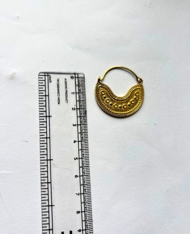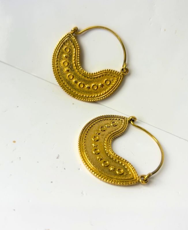 These elegant crescent-shaped earrings bring a classic tribal aesthetic to any design. Featuring a smooth outer rim, fine beaded detailing, and intricate circular dot motifs within, they exude a vintage charm. The lightweight yet sturdy brass construction makes them suitable for both everyday wear and special occasions.