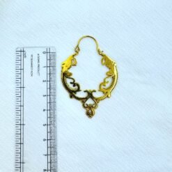 Handcrafted gold plated brass earring featuring an open crescent shape and intricate scroll detailing inspired by nature, balance, and bohemian symbolism. Lightweight and perfect for a bold yet elegant look.