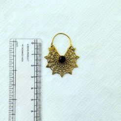 Elevate your style with these handcrafted tribal-inspired brass earrings. Featuring a delicate mandala filigree design and a deep cabochon stone, these lightweight hoops offer a perfect blend of bohemian charm and antique elegance.