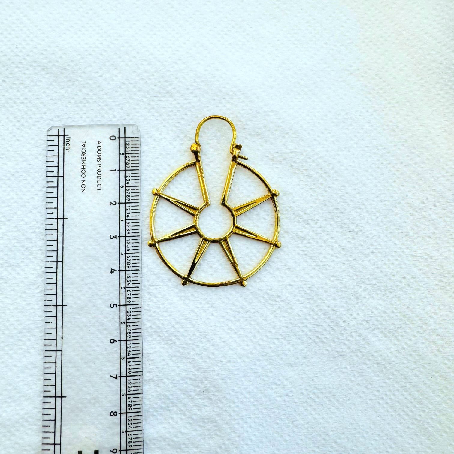 These striking brass wheel hoop earrings feature a clean, open geometric design inspired by ancient symbols of movement, balance, and cycles. The circular form is divided into bold segments, creating a modern yet timeless tribal aesthetic.