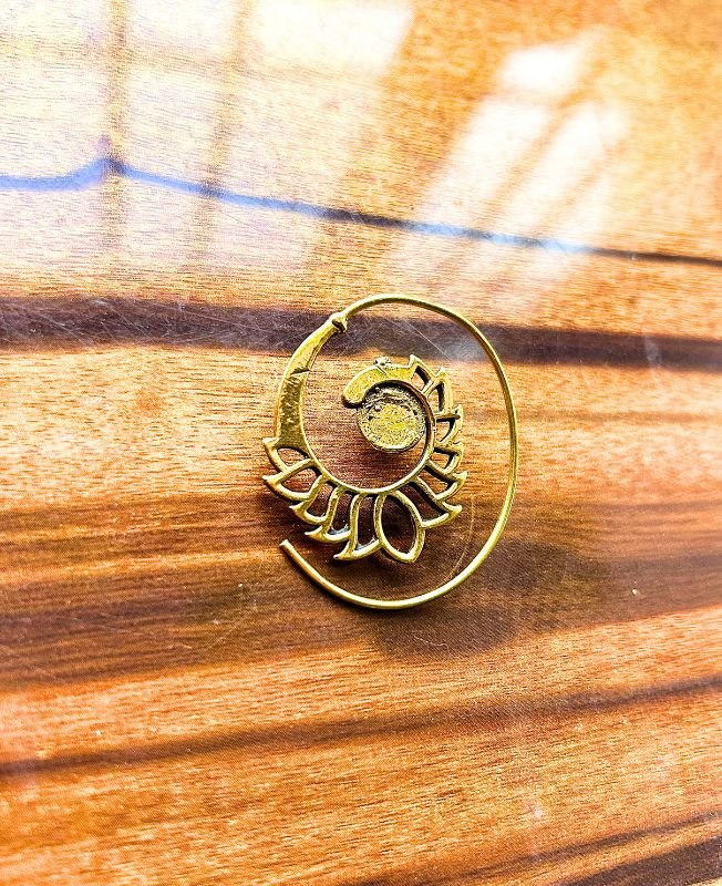 This handcrafted brass spiral earring embodies traditional artistry with a modern twist. The earring showcases an intricate tribal-style spiral design that gently curves into a circular shape, symbolizing infinity and balance. At its center sits a smooth white stone that adds contrast and harmony to the golden tones of the brass.