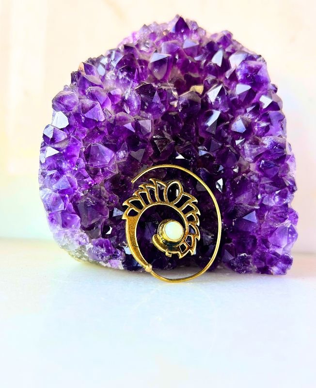 Elegant brass spiral earring featuring a tribal-inspired design with a white stone centerpiece, handcrafted for a bold and artistic look.